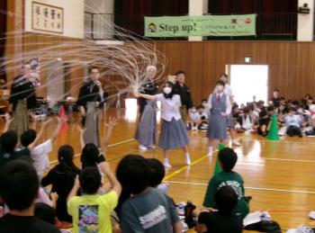 説明の途中では、児童生徒の代表者が能面や能装束(のうしょうぞく)を実際に着けたり、小道具の紙でできた蜘蛛の巣を投げたりと、体験も行わせていただきました。