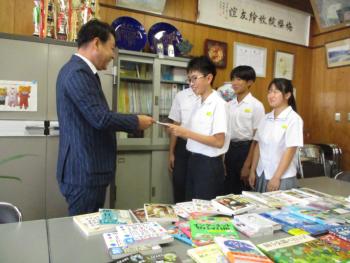 公益社団法人佐世保法人会様より図書寄贈をしていただきました。生徒からの要望をふまえて選定されたたくさんの図書を寄贈していただきました。本校の図書室は、小学校6年生と中学生とともに使用しております。毎日昼休みに児童、生徒に図書館を開放し、図書とふれあう環境を整えています。インターネットの普及に伴い、本からの情報収集の機会が少なくなっている中ではありますが、図書室に子どもたちがいない日はありません。新しい本は、図書室に特設コーナーを設けて児童、生徒たちへ案内する予定です。たくさんの本を寄贈していただき、ありがとうございました。