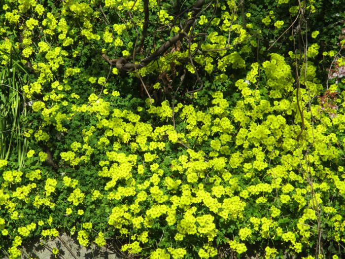 校内を流れる小川の土手に群生しているオオキバナカタバミの花が満開です。繁殖力の強い外来種ですが、群生して花を咲かせているさまは、花言…