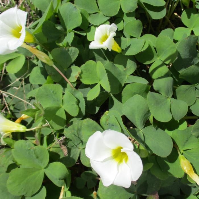 校内巡視をしていると、校庭の一角で白いカタバミを発見。黄色いカタバミは校内各所に群生していますが、白いカタバミは少数派です。白も、と…