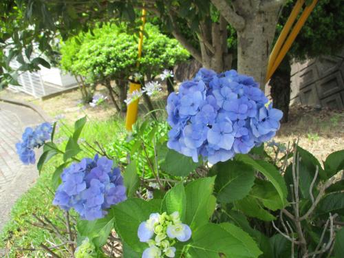 梅雨の合間の晴れの日に、青いあじさいが映えています。