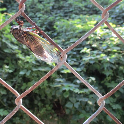 クマゼミが校庭の金網にとまって、元気な鳴き声を響かせていました。