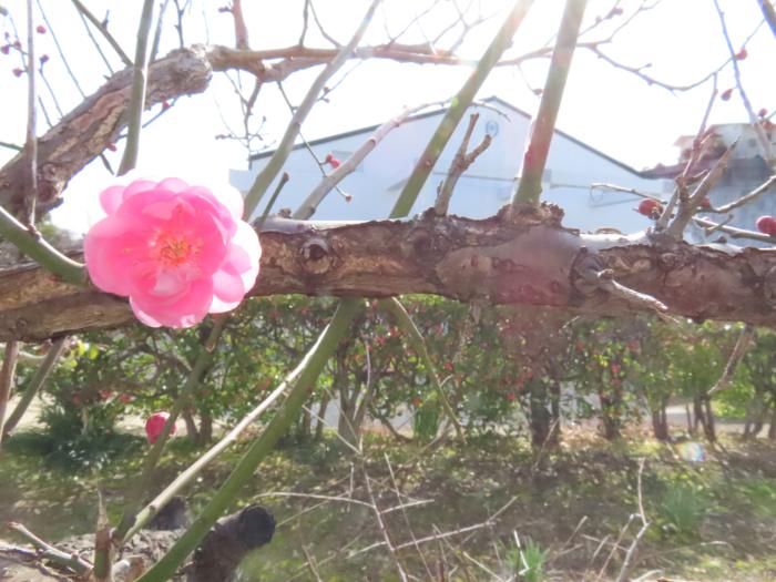 | 八重の梅、一番花ほころぶ |
