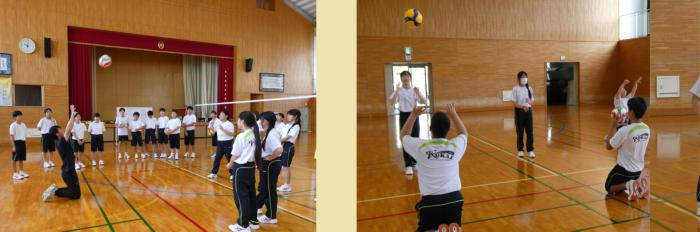 1年生の体育です。バレーボールの学習に取り組みました。本時は、基本的なパスを身に着けようという目標で練習しました。ペアを作り、まず膝をついた姿勢で練習しました。その後、お互いに立った普通の状態で練習しました。パスが続くと笑顔が広がっていました。
