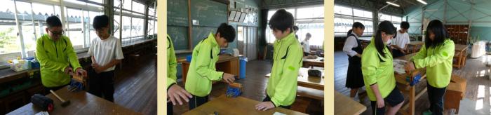 1年生の技術です。木工を学習中です。本時はかんなの使い方を学びました。万力を使い、木材を固定しました。げんのうで刃の出具合などを調整して、実際に削りました。