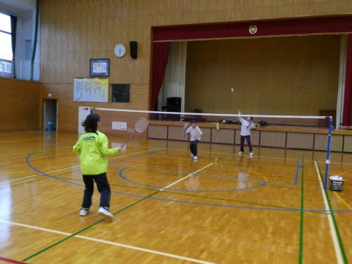放課後の体育館です。シャトルを追いかける部員たちの真剣な眼差しが印象的です。顧問の先生が見守る中、一打一打に集中して取り組んでいます。