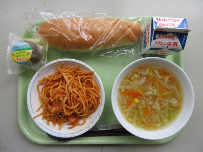 5月1日(水)の給食 今日の献立は、「牛乳・米粉パン・野菜スープ・ナポリタン・世知原茶マフィン」でした。子どもたちの大好きな献立で、今日も美味しくいただきました。