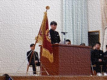 新生徒会長 こんにちは。Mです。私が生徒会長になった理由の一つは、生徒会長への憧れでした。その憧れのM会長から校旗を受け取り、私は今やる気に満ち溢れて…