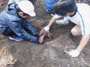 秋の収穫 夏に植えたさつまいもが大きく育ちました。小学生も一緒に、固くなった畑の土をスコップで一生懸命掘り起こしていました。掘り進めるごとに丸々とし…