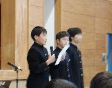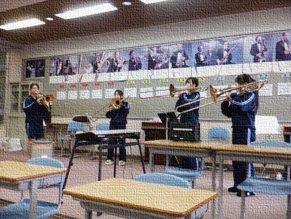 トロンボーン四重奏 今日、吹奏楽部の4人がアンサンブルコンテストに出場します。前日には本校職員を観客としてお披露目会があり、緊張感をもって演奏しました。曲は「…