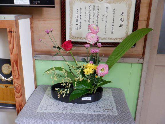 夏は、花材がなかなか揃わないそうですが、今回は、バラやトルコキキョウ、アジサイの葉が…