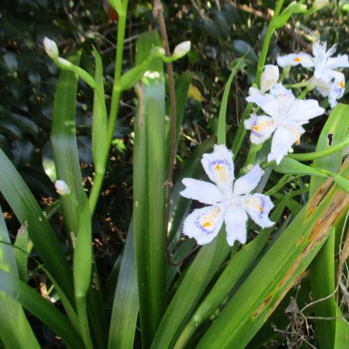 校庭の木陰で、シャガの花が見頃を迎えています。アヤメに似た白地に青やオレンジの斑点模様が特徴で、光が差し込むとキラキラと輝いて見えま…