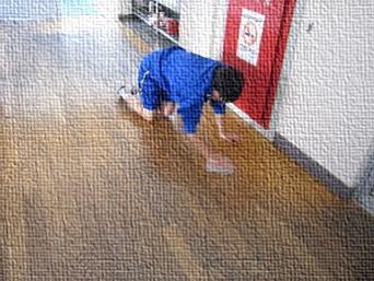 「場を清める」 週に3回の掃除の様子です。手分けして隅々まできれいにしています。ほうきで効率よくごみを集め、雑巾がけは、板の目にそって拭き上げています。自…