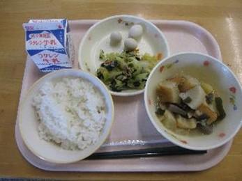 今日の給食は熱々おでんでした。昆布の出汁がきいていて、大根の芯まで染み込んだおいしいおでんです。ウズラの玉子は別管に入って、全員にいきわたるようになっています。お昼の放送「オールランチユノキ」では、おでんは室町時代の田楽が発祥だと紹介していました。なるほど、勉強になります。