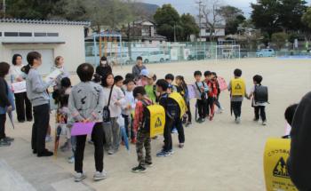 初めての授業を終えて 1年生が午前中3時間の授業を受けて、地区ごとに集団下校をしている様子です。担任によると、どの子もちゃんと席に着いてよく頑張ったそうです。さ…
