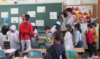 初めての給食 1年生になって、初めての給食。メニューはカレーライスとフルーツポンチです。初めてなので、6年生に給食着の着方から、配膳の仕方、並び方まで教…