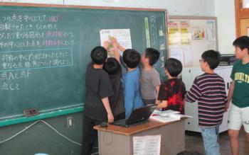 対称な図形 6年生が算数の時間に対称な図形の性質について学習をしています。「対称の中心で180°まわしたときに重なる点」をみんなで見つけていました。担…