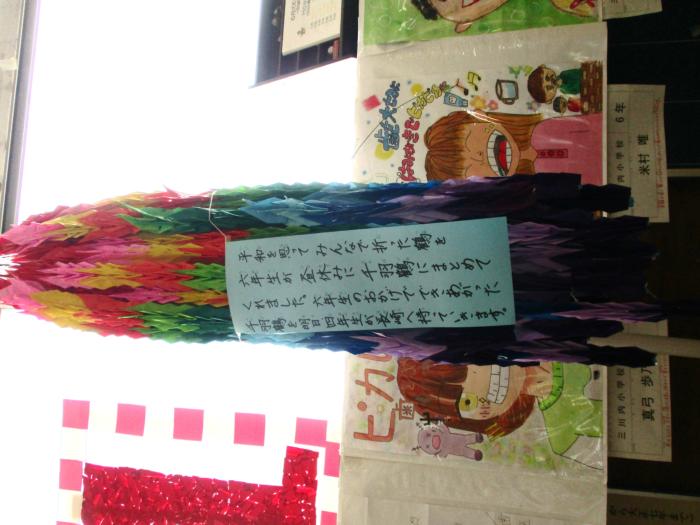 みんなで作った千羽鶴 全校みんなで平和の祈りを込め作った千羽鶴。6年生が中心となって紐でつないでくれました。グラデーションになっていてすてきな千羽鶴です。明日、…