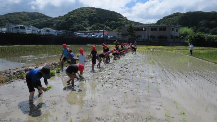 頑張った 田植え! 今日の午前中、5年生が田植えを行いました。近くの田んぼをお借りし、川中さんご指導のもと苗を手で植えていきました。ぬかるみにはまってしまう子…