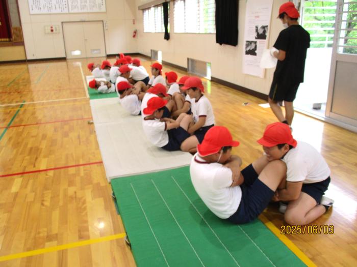 6月3日、2〜3校時に体力テストを行いました。今日は雨で運動場が使えませんでしたので、体育館でできる4種目(上体起こし・長座体前屈・反復横…