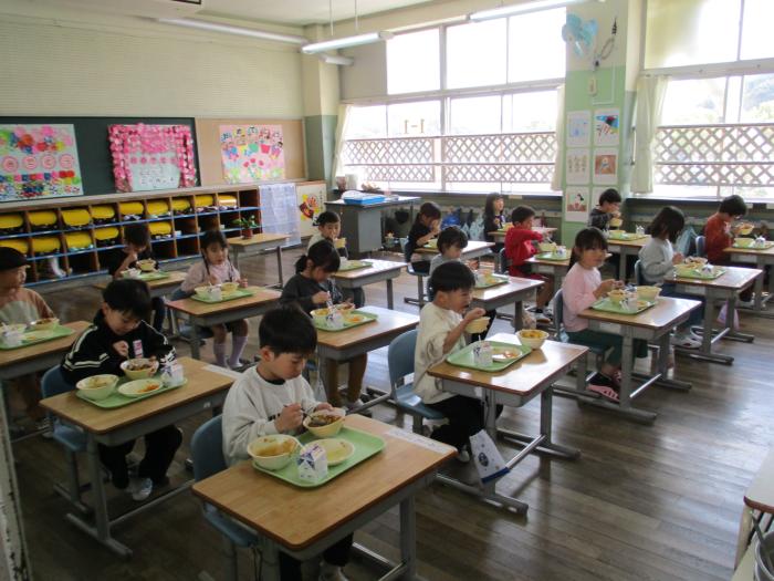 初めての給食 今日から1年生の給食が始まりました。メニューは「チキンカレー」と「フルーツカクテル」でした。みんな笑顔でおいしそうに食べていました。カレー…