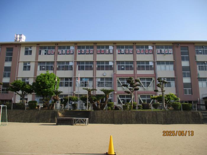 今年の運動会のスローガン決まる! 今年の運動会のスローガンが代表委員会で決まり、校舎4階の窓に掲示されています。今年のスローガンは「元気いっぱい みんなで団結し、あったかい…