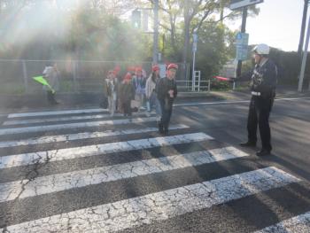 ○幹線道路の横断では、駐在所のおまわりさんや保護者の方が、安全のために横断歩道に立ってくださっていました。