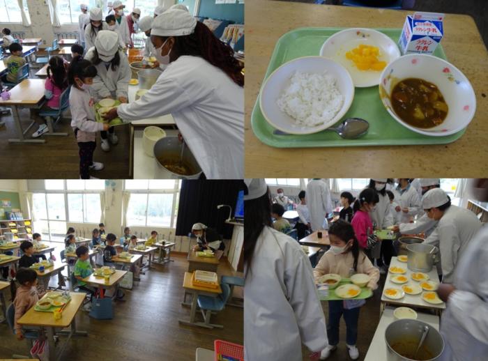 最初のメニューはカレーライス! 今日から1年生の給食がスタートしました。小学校で食べる最初のメニューは一番人気のカレーライスです。準備を6年生が手伝いながら行い、静かに席に…