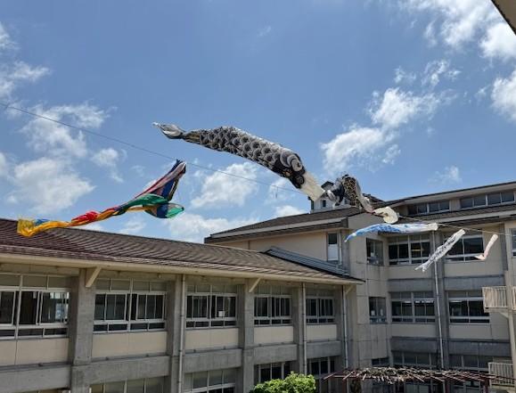 久しぶりの青空に泳ぐ 日差しぶりに晴れた一日でした。これまでのうっぷんを晴らすかの如く運動場で楽しそうに遊ぶ子供たちでした。そんな中今年も中庭に鯉のぼりをあげまし…