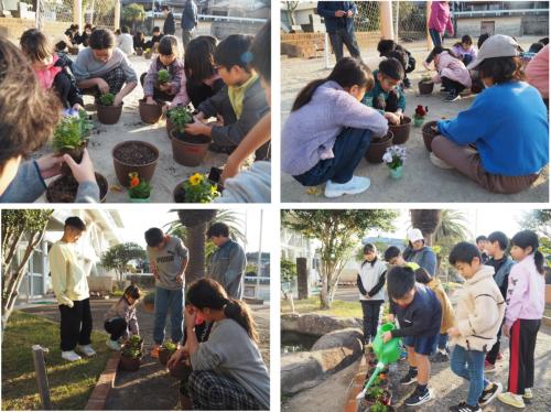 12月9日(火)全校児童でパンジーとノースポールの苗を植えました。卒業式や入学式を花いっぱいでお祝いするための取組です。これからの寒い時期を乗り越え、たくさんの花が咲いてほしいです。