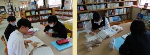 1年生の総合的な学習の時間です。進路学習を行い、図書室で職業調べに取り組みました。生徒たちが手に取っているのは、名著「13歳のハロー…